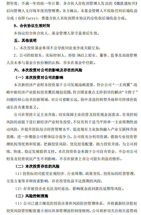 公司稱,本次新經(jīng)濟產(chǎn)業(yè)財務投資基于公司發(fā)展戰(zhàn)略需要,符合公司“一主兩翼”戰(zhàn)略中新經(jīng)濟產(chǎn)業(yè)股權投資翼的規(guī)劃范圍,對公司著眼長遠、穩(wěn)中求進的轉(zhuǎn)型升級和可持續(xù)價值成長具有重要意義。