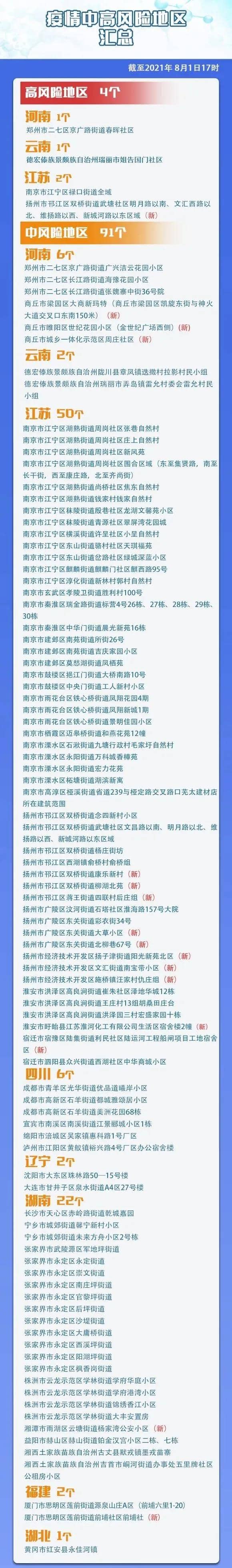 8月1日,據(jù)“揚州發(fā)布”微信公眾號消息,經(jīng)揚州市新冠肺炎疫情防控工作指揮部研究,自8月1日起,對揚州市部分區(qū)域疫情風(fēng)險等級進行調(diào)整,揚州市邗江區(qū)雙橋街道武塘社區(qū)明月路以南、文匯西路以北、維揚路以西、新城河路以東區(qū)域由中風(fēng)險地區(qū)調(diào)整為高風(fēng)險地區(qū);揚州市廣陵區(qū)東關(guān)街道大草小區(qū);揚州市廣陵區(qū)東關(guān)街道北柳巷67號;揚州市邗江區(qū)雙橋街道康樂新村等8個小區(qū)為中風(fēng)險地區(qū)。