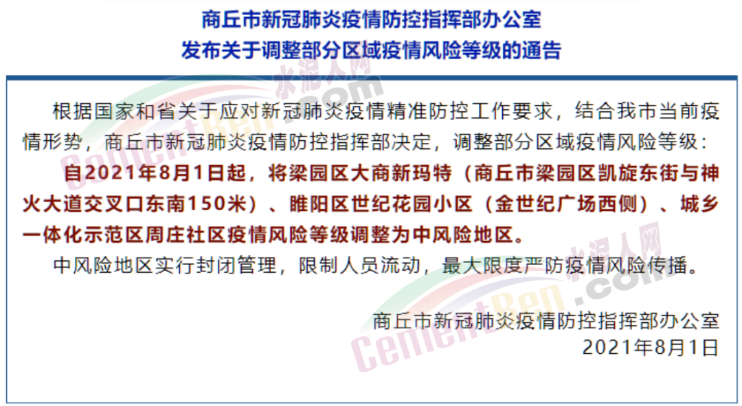 河南商丘市新冠肺炎疫情防控指揮部辦公室發(fā)布《商丘市新冠肺炎疫情防控指揮部辦公室發(fā)布關(guān)于調(diào)整部分區(qū)域疫情風(fēng)險等級的通告》稱,自8月1日起,將梁園區(qū)大商新瑪特(商丘市梁園區(qū)凱旋東街與神火大道交叉口東南150米)、睢陽區(qū)世紀(jì)花園小區(qū)(金世紀(jì)廣場西側(cè))、城鄉(xiāng)一體化示范區(qū)周莊社區(qū)疫情風(fēng)險等級調(diào)整為中風(fēng)險地區(qū)。中風(fēng)險地區(qū)實行封閉管理,限制人員流動,最大限度嚴(yán)防疫情風(fēng)險傳播。