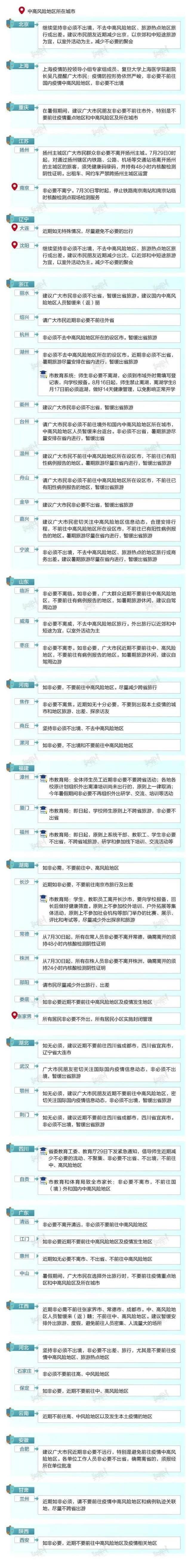 據(jù)不完全統(tǒng)計,截至7月30日18時,全國共有19個?。ㄗ灾螀^(qū)、直轄市)發(fā)布53條疫情防控出行提醒,涉及46個城市。其中,29個省市提醒市民“非必要不出省、不離市”或“減少出省、出市”,占全部出行提醒數(shù)量的5成以上。超7成省市提到"不去中高風(fēng)險地區(qū)",有5成省市建議市民"暫緩出省旅游"或選擇“周邊游”。浙江、福建、湖南、四川I4省部分城市的教育系統(tǒng)均對暑期師生防疫工作提出嚴(yán)格要求,取消相關(guān)的外出交流、培訓(xùn)活動。