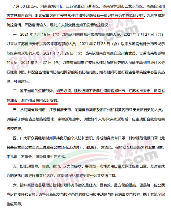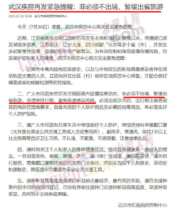 7月31日,湖北疾控連續(xù)發(fā)出多個緊急提示,鑒于當(dāng)前的疫情形勢,如無必須,建議近期不要前往河南省鄭州市、江蘇省淮安市、湖南省株洲市、湘西州及黃岡市紅安縣。