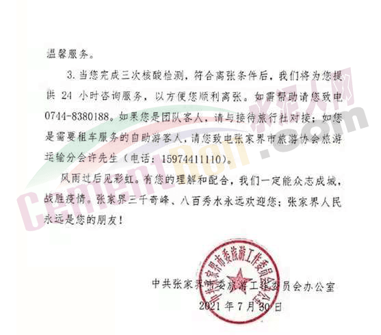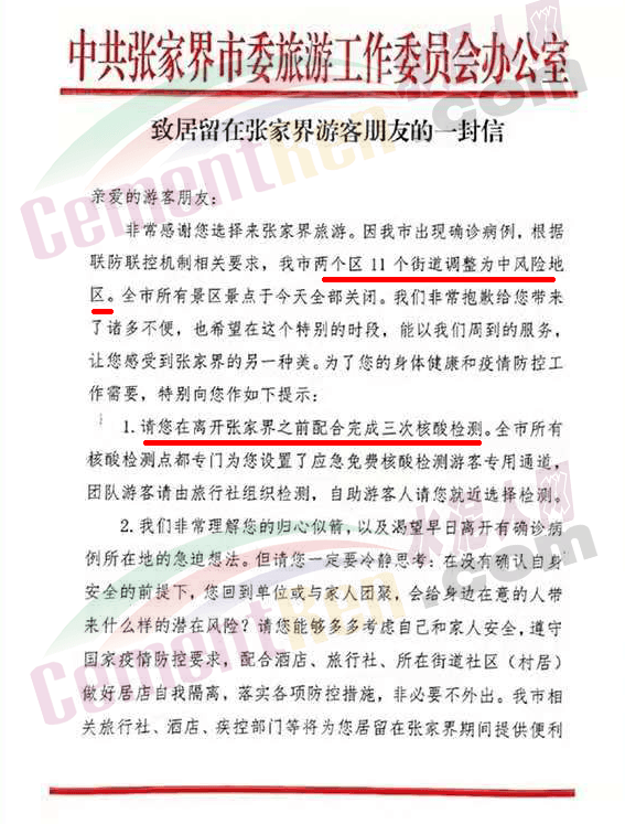 7月30日,湖南省張家界發(fā)布《致居留在張家界游客朋友的一封信》,稱根據(jù)聯(lián)防聯(lián)控機制相關(guān)要求,張家界兩個區(qū)11個街道調(diào)整為中風(fēng)險地區(qū)。全市所有景區(qū)景點于今天全部關(guān)閉,提示游客在離開張家界之前配合完成三次核酸檢測。