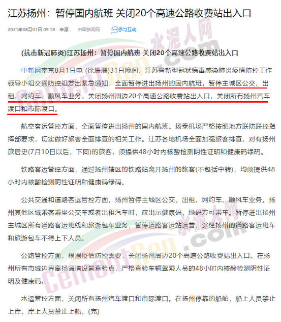 7月31日晚間,江蘇省新型冠狀病毒感染肺炎疫情防控工作領(lǐng)導(dǎo)小組交通防控組發(fā)出緊急通知:全面暫停進出揚州的國內(nèi)航班,暫停主城區(qū)公交、出租、網(wǎng)約車、順風(fēng)車業(yè)務(wù),關(guān)閉揚州周邊20個高速公路收費站出入口,關(guān)閉所有揚州汽車渡口和市際渡口。