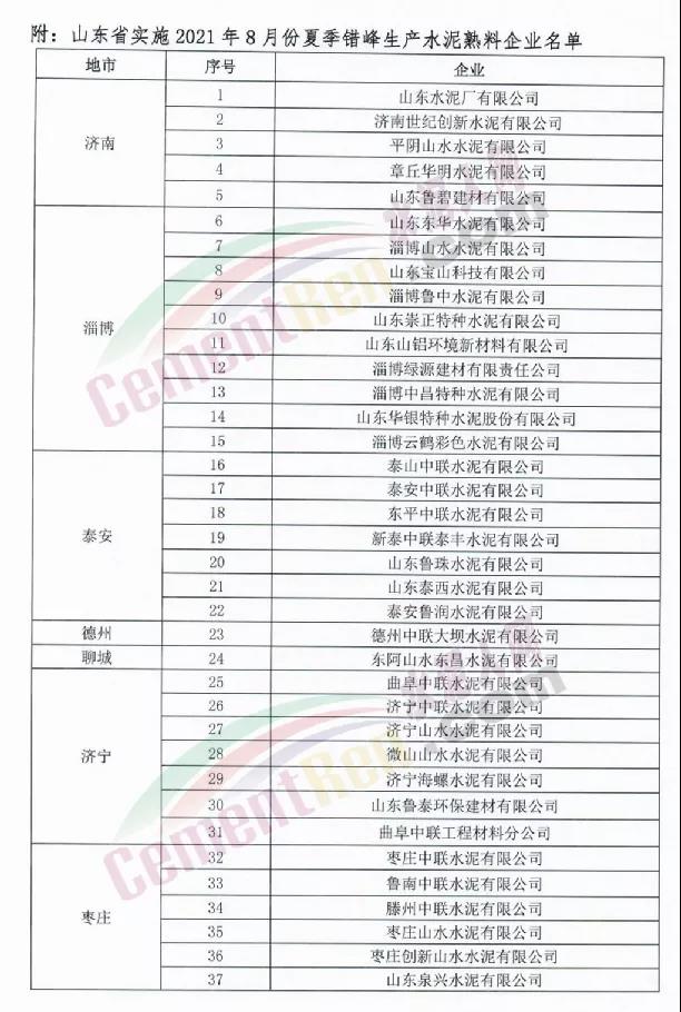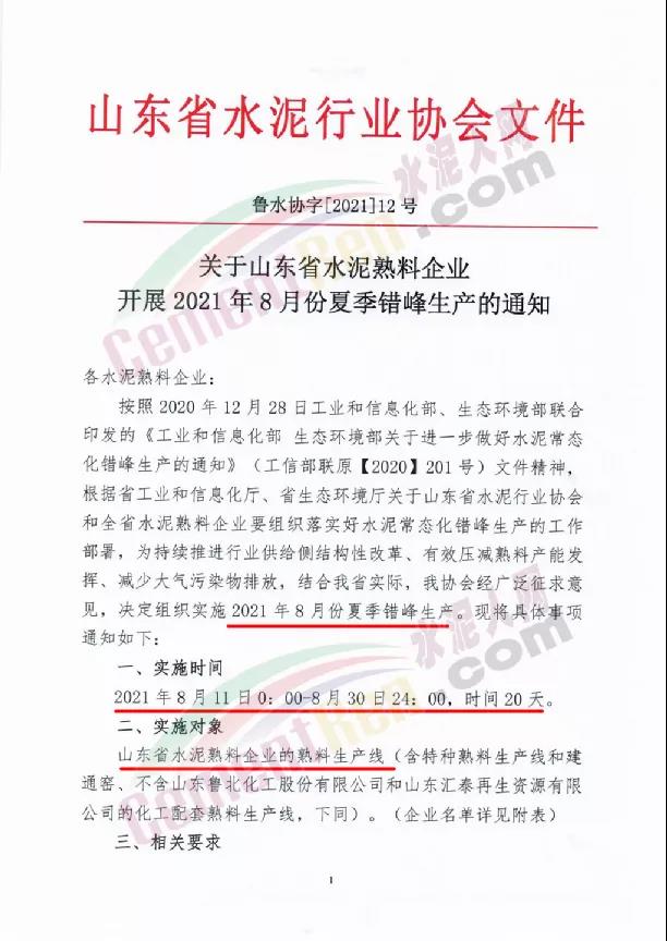 7月30日山東省水泥行業(yè)協(xié)會發(fā)布《關(guān)于山東省水泥熟料企業(yè)開展2021年8月份夏季錯峰生產(chǎn)的通知》稱按照相關(guān)文件要求將組織山東省水泥熟料企業(yè)的熟料生產(chǎn)線實施2021年8月份夏季錯峰生產(chǎn)。