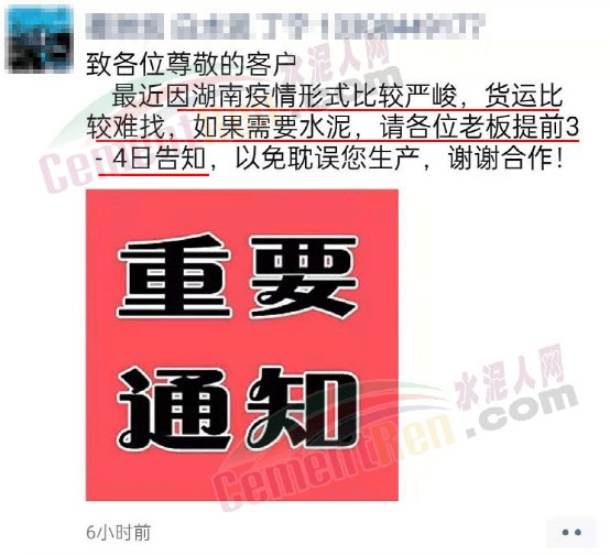 日前,葛洲壩石門(mén)特種水泥有限公司通知,最近因湖南疫情形勢(shì)比較嚴(yán)峻,貨運(yùn)比較難找,如果需要水泥,請(qǐng)?zhí)崆?-4日告知,以免耽誤生產(chǎn)。