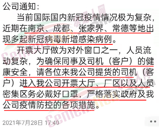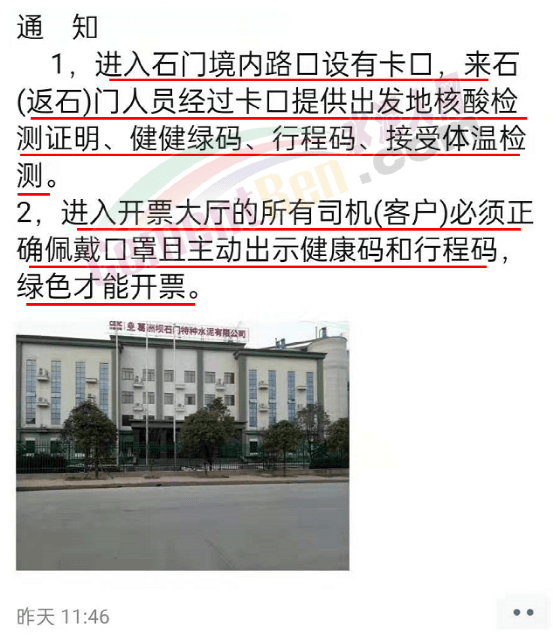 據(jù)水泥人網(wǎng)了解,企業(yè)近兩日連續(xù)發(fā)布提示通知,提示車(chē)輛進(jìn)入石門(mén)境內(nèi)路口設(shè)有卡口,來(lái)往人員經(jīng)過(guò)卡口需提供出發(fā)地核酸檢驗(yàn)證明、健康綠碼、行程碼并接受體溫檢測(cè)。同時(shí)進(jìn)入開(kāi)票大廳的所有司機(jī)(客戶(hù))必須正確佩戴口罩,主動(dòng)出示健康碼,行程碼,綠色才能開(kāi)票。