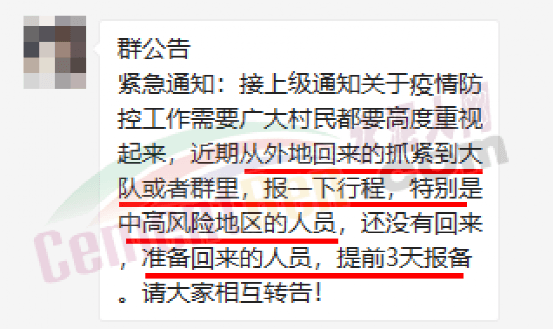 據(jù)上述銷(xiāo)售人員反饋,村里發(fā)了緊急通知稱(chēng),接到上級(jí)通知,要求從外地回村的人員抓緊報(bào)備行程,特別是從中高風(fēng)險(xiǎn)地區(qū)返回的人員。還沒(méi)有回來(lái)的,準(zhǔn)備回來(lái)的人員,提前3天報(bào)備。