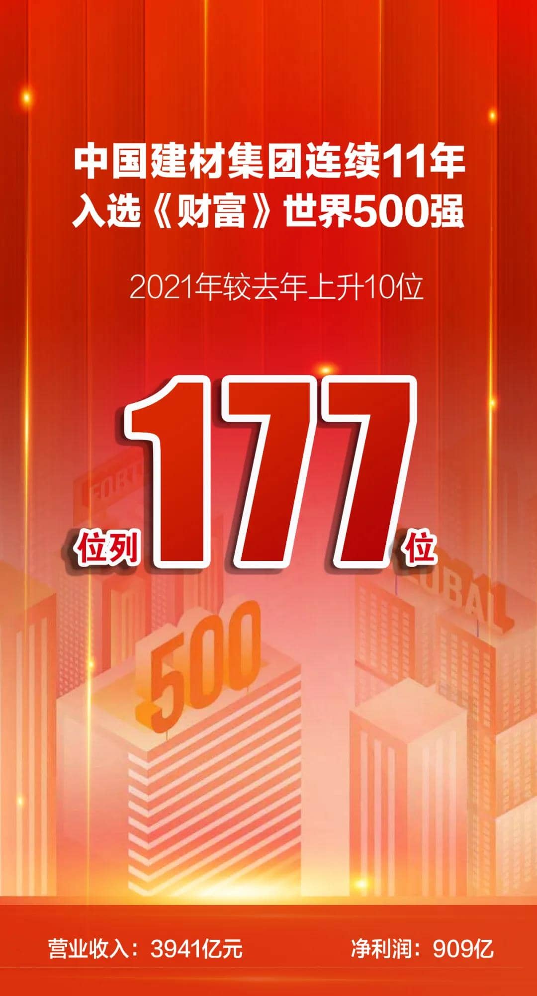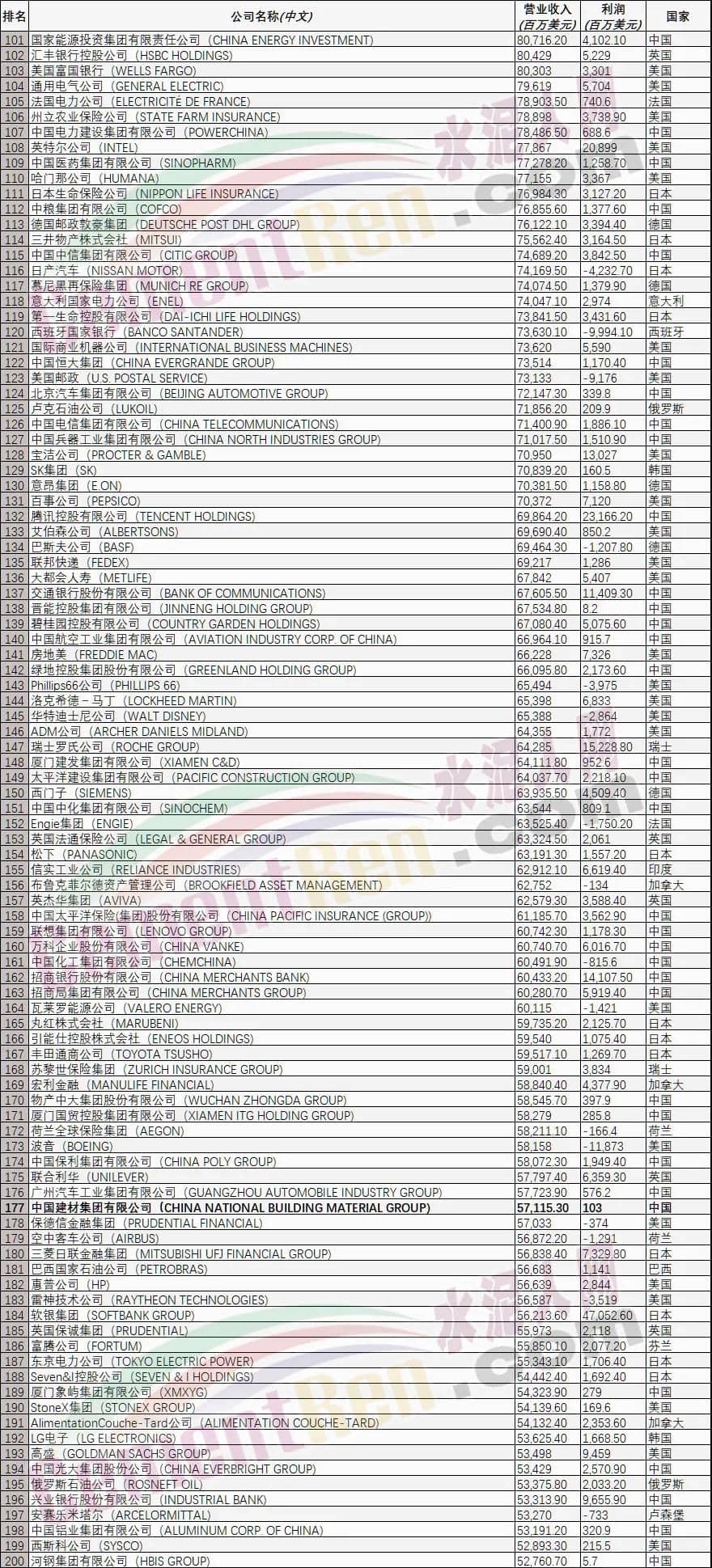 8月2日,2021年《財(cái)富》世界500強(qiáng)排行榜發(fā)布,中國(guó)建材集團(tuán)以571.15億美元連續(xù)第11年入圍該榜單,位列177位,比上一年度前進(jìn)10位,繼續(xù)穩(wěn)坐全球建材行業(yè)榜首位置。同時(shí)上榜的建材企業(yè)還有法國(guó)圣戈班集團(tuán)266位,安徽海螺集團(tuán)315位,愛爾蘭CRH441位。