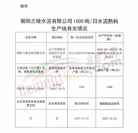 7月30日,遼寧省工信廳發(fā)布關(guān)于朝陽(yáng)蘭陵水泥有限公司1000噸/日水泥熟料生產(chǎn)線遷建的公示。方案經(jīng)朝陽(yáng)市同意、企業(yè)和葫蘆島市申請(qǐng),擬將朝陽(yáng)蘭陵水泥有限公司1000噸/日水泥熟料生產(chǎn)線遷建至葫蘆島市南票區(qū),原址生產(chǎn)線計(jì)劃在2023年10月25日關(guān)停,公示如下: