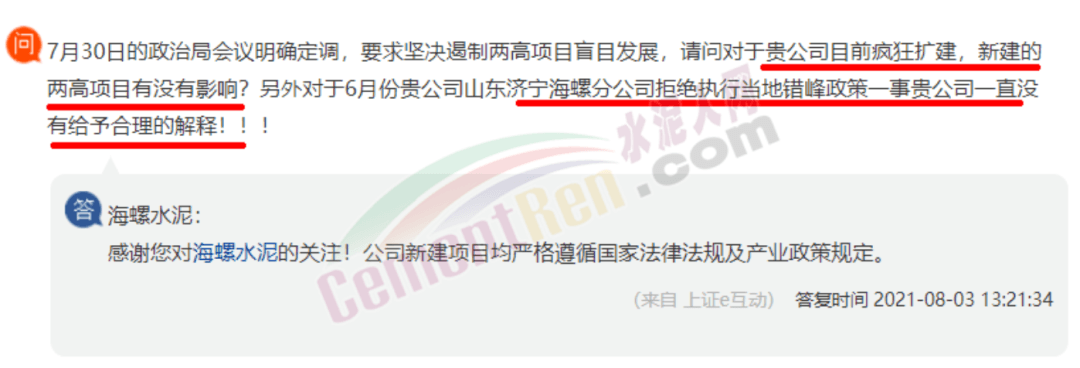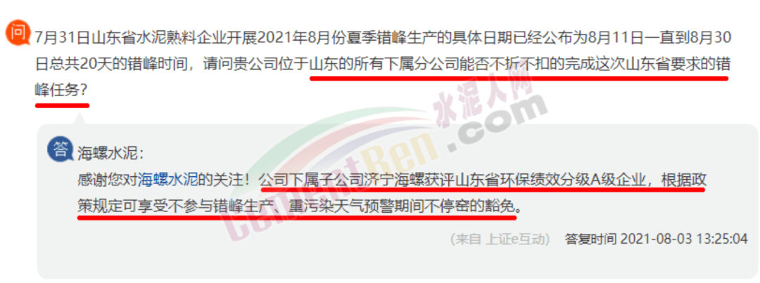日前,有股友在上市平臺向海螺水泥提問,“7月31日山東省水泥熟料企業(yè)開展2021年8月份夏季錯峰生產(chǎn)的具體日期已經(jīng)公布為8月11日一直到8月30日總共20天的錯峰時(shí)間,請問貴公司位于山東的所有下屬分公司能否不折不扣的完成這次山東省要求的錯峰任務(wù)?”
