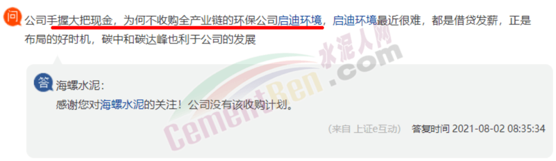 還有股友給海螺水泥支招收購啟迪環(huán)境,并稱啟迪環(huán)境最近很難,借貸發(fā)薪,正是布局的好時(shí)機(jī),碳中和,碳達(dá)峰也利于公司的發(fā)展。海螺水泥回復(fù)稱,公司沒有該收購計(jì)劃。