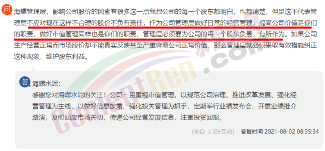 更有股民對海螺管理層直言稱:“影響公司股價(jià)的因素有很多這一點(diǎn)公司的每一個股東都明白,也都清楚,但是這不代表管理層不應(yīng)對現(xiàn)在這樣不合理的股價(jià)不負(fù)有責(zé)任,作為公司管理層做好日常的經(jīng)營管理,提高公司價(jià)值是你們的職責(zé),做好市值管理同樣也是你們的職責(zé),管理層必須要為公司的每一個股東負(fù)責(zé),有所作為。如果公司生產(chǎn)經(jīng)營正常而市場股價(jià)卻不能真實(shí)反映甚至嚴(yán)重背離公司正常價(jià)值,那么管理層就必須采取有效措施糾正這種現(xiàn)象,維護(hù)股東利益。”