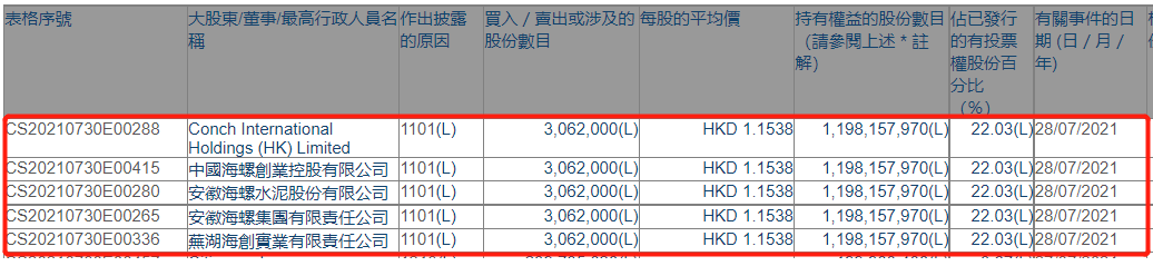 增持后,海螺水泥或其一致行動人最新持股數(shù)目為1,198,157,970股,持股比例由21.97%上升至22.03%。