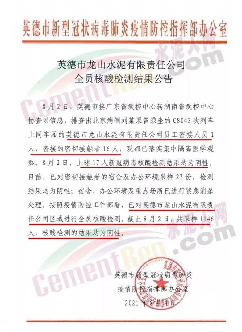 英德龍山水泥有限公司 全員核酸結(jié)果公告!