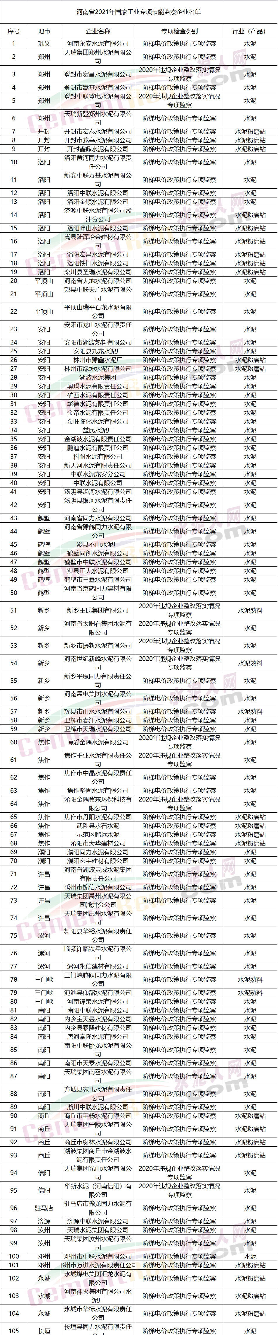 近日,河南省工業(yè)和信息化廳發(fā)布了《關于下達2021年國家工業(yè)專項節(jié)能監(jiān)察任務的通知》,通知顯示:2021年河南省省工業(yè)專項節(jié)能監(jiān)察任務總量為238家。其中,105家水泥企業(yè)被納入國家工業(yè)專項節(jié)能監(jiān)察水泥企業(yè)名單,《通知》原文如下: