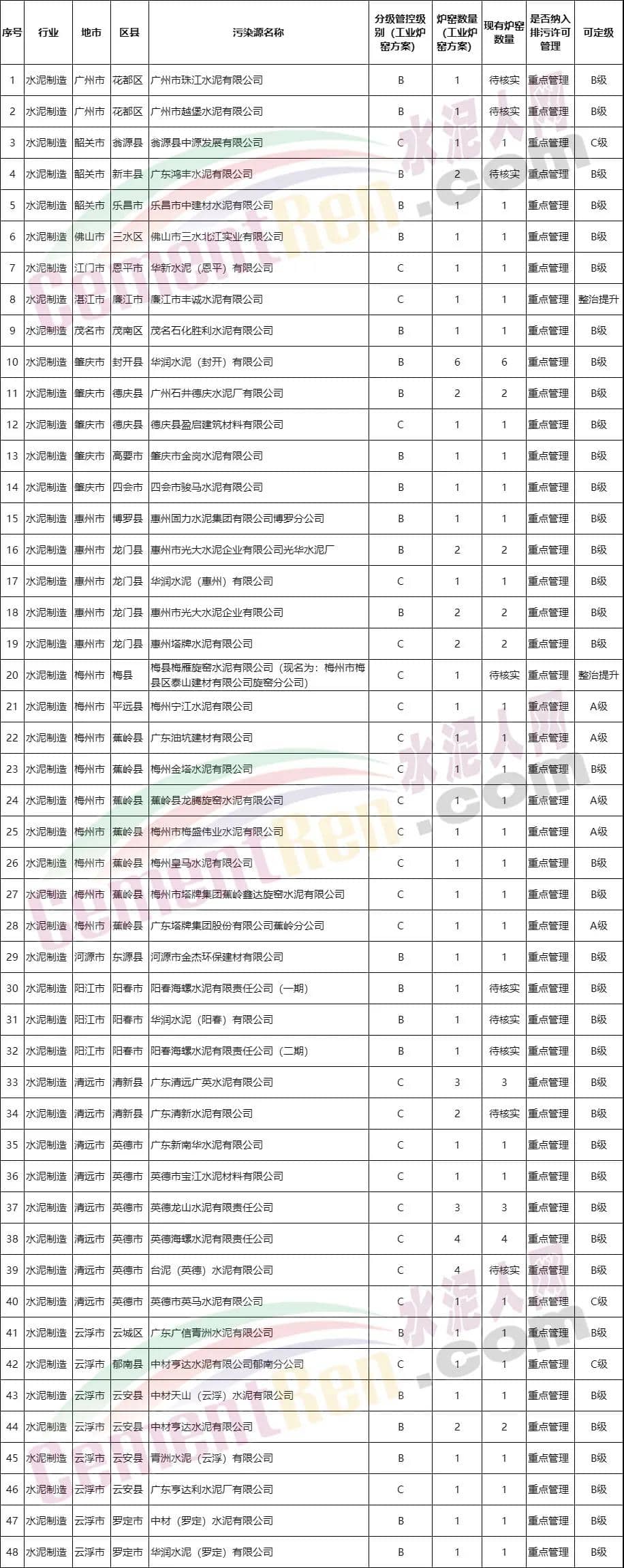 從全省水泥制造行業(yè)工業(yè)爐窯分級(jí)管控表可見梅州寧江水泥有限公司、廣東油坑建材有限公司、蕉嶺縣龍騰旋窯水泥有限公司、梅州市梅盛偉業(yè)水泥有限公司、廣東塔牌集團(tuán)股份有限公司蕉嶺分公司等五家企業(yè)可定級(jí)為A級(jí);中材、海螺、華潤(rùn)、華新、臺(tái)泥、光大等38家企業(yè)可定級(jí)為B;翁源縣中源發(fā)展有限公司、英德市英馬水泥有限公司、中材亨達(dá)水泥有限公司郁南分公司三家企業(yè)可定級(jí)為C;廉江市豐誠(chéng)水泥有限公司、梅縣梅雁旋窯水泥有限公司(現(xiàn)名為:梅州市梅縣區(qū)泰山建材有限公司旋窯分公司)兩家企業(yè)可定級(jí)為“整治提升”。