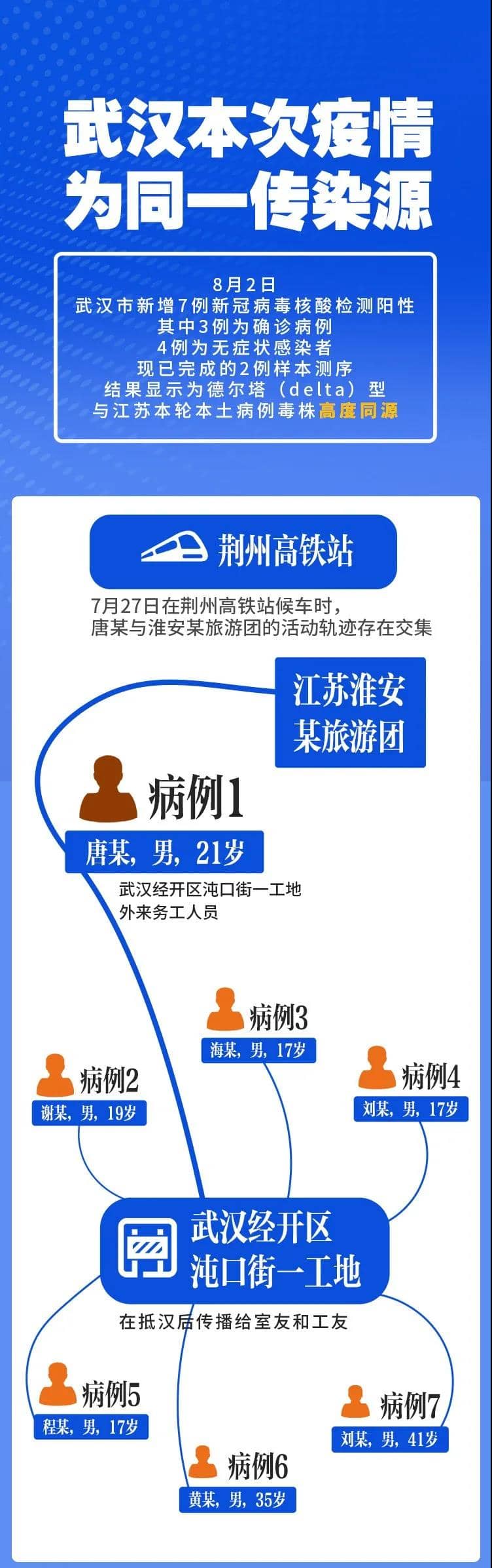 8月1日晚上,武漢經(jīng)開區(qū)在對淮安某旅游團(tuán)重點(diǎn)區(qū)域駐留人員排查中,發(fā)現(xiàn)沌口街一工地外來務(wù)工人員唐某,曾于7月27日在荊州高鐵站候車時(shí),與淮安某旅游團(tuán)的活動(dòng)軌跡存在交集。8月2日上午,唐某及與其密接的6名人員核酸檢測陽性。同期,安徽一工地查出2名密接者軌跡,已追蹤隔離51人。