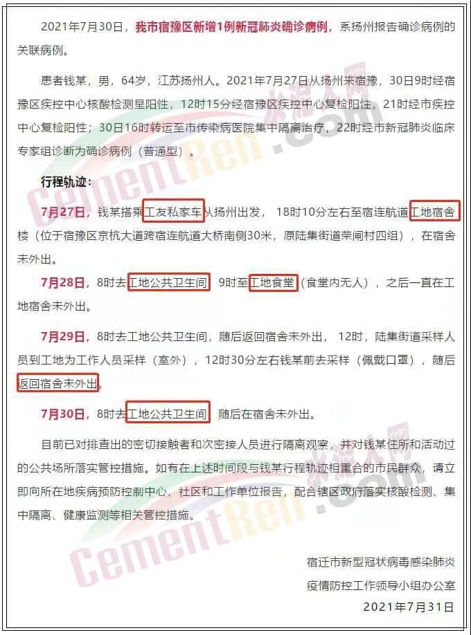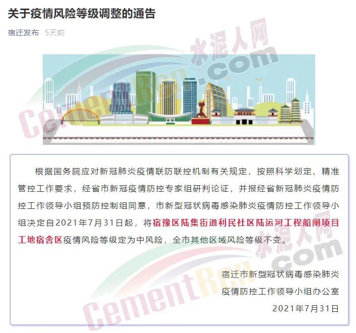 7月30日,江蘇宿遷一工地宿舍確診1例新冠肺炎病例,7月31日,將該宿舍區(qū)疫情風(fēng)險(xiǎn)等級定為中風(fēng)險(xiǎn)。