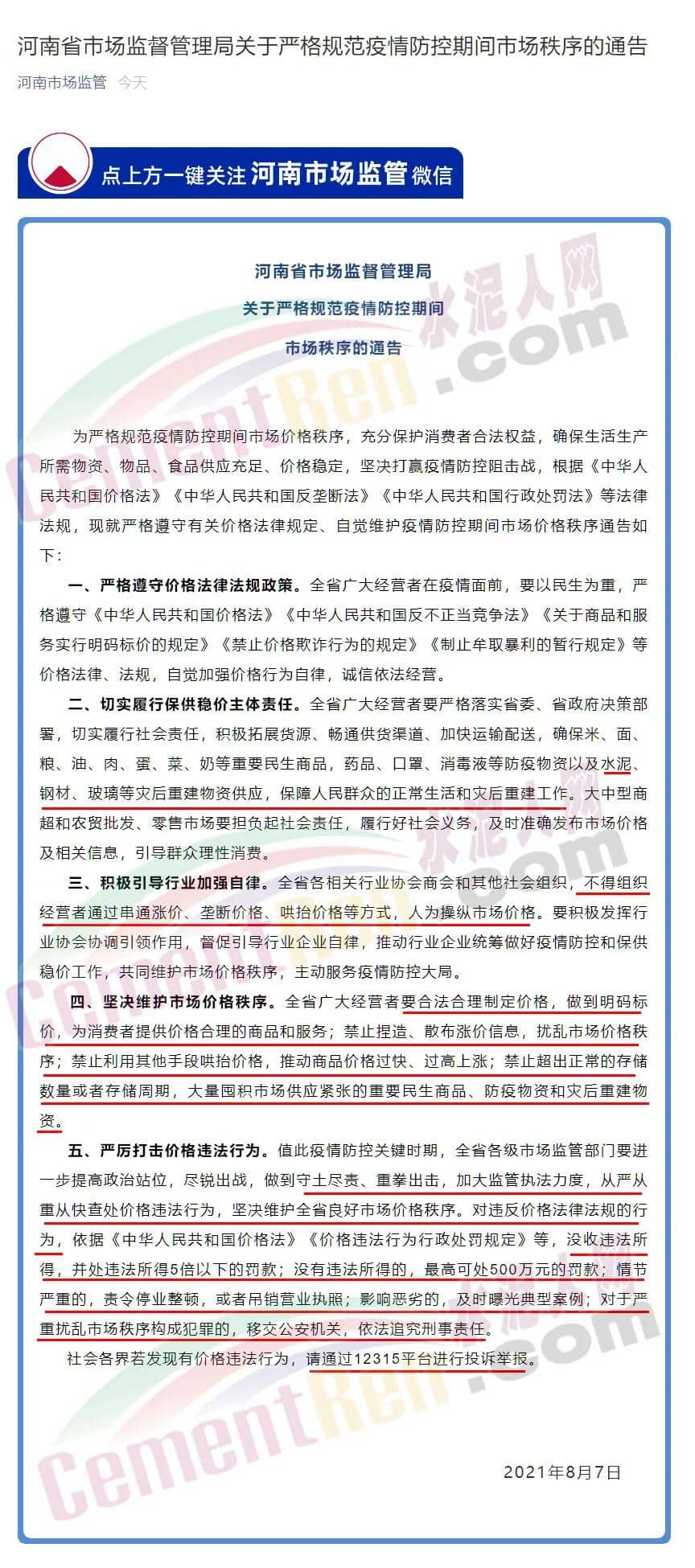 8月7日河南省市場(chǎng)監(jiān)督管理局發(fā)布《關(guān)于嚴(yán)格規(guī)范疫情防控期間市場(chǎng)秩序的通告》稱,為嚴(yán)格規(guī)范疫情防控期間市場(chǎng)價(jià)格秩序,充分保護(hù)消費(fèi)者合法權(quán)益,確保生活生產(chǎn)所需物資、物品、食品供應(yīng)充足、價(jià)格穩(wěn)定,堅(jiān)決打贏疫情防控阻擊戰(zhàn),根據(jù)相關(guān)法律法規(guī),就嚴(yán)格遵守有關(guān)價(jià)格法律規(guī)定、自覺(jué)維護(hù)疫情防控期間市場(chǎng)價(jià)格秩序作出通告。