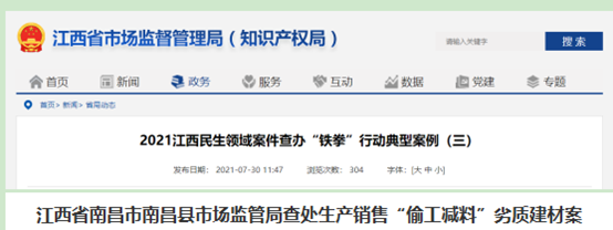 7月30日江西省市場監(jiān)督管理局發(fā)布了2021江西民生領域案件查辦“鐵拳”行動典型案例其中提到一起劣質建材案。