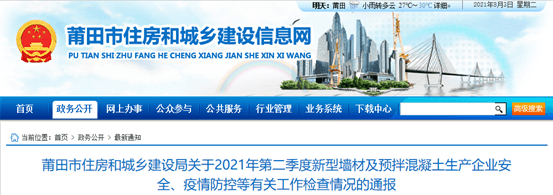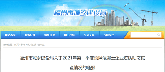 福州城鄉(xiāng)建設局《關于2021年第一季度預拌混凝土企業(yè)資質動態(tài)核查情況的通報》