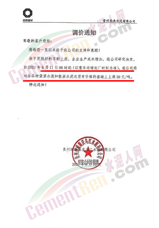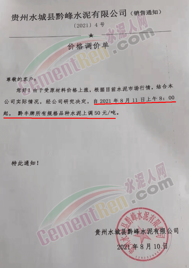 8月10日,貴州水城縣黔峰水泥有限公司通知,由于受原材料價格上漲,根據(jù)目前水泥市場行情,結(jié)合本公司實際情況,經(jīng)公司研究決定,自8月11日上午8時起,黔豐牌所有規(guī)格品種水泥上調(diào)50元/噸。