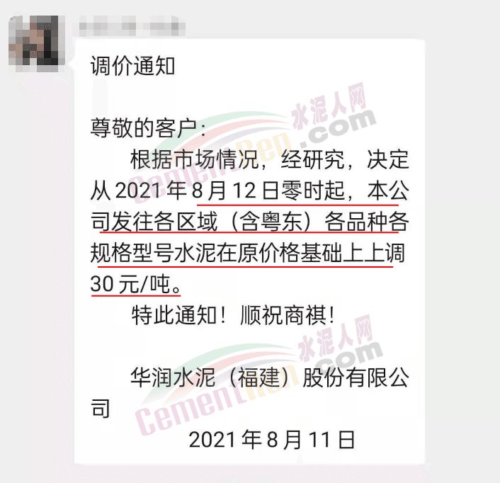 華潤水泥(福建)股份有限公司通知,根據(jù)市場情況,經(jīng)研究決定從8月12日零時(shí)起,公司發(fā)往各區(qū)域(含粵東)各品種各規(guī)格型號(hào)水泥在原價(jià)格基礎(chǔ)上上調(diào)30元/噸。