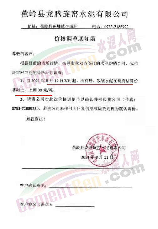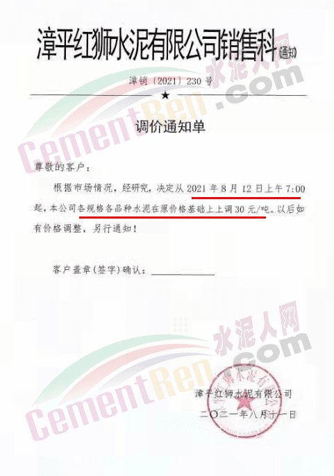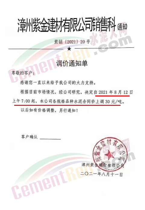 漳州紫金建材有限公司銷售科通知,根據(jù)目前市場情況,自8月12日上午7時(shí)起,公司各規(guī)格品種水泥合同價(jià)上調(diào)30元/噸。