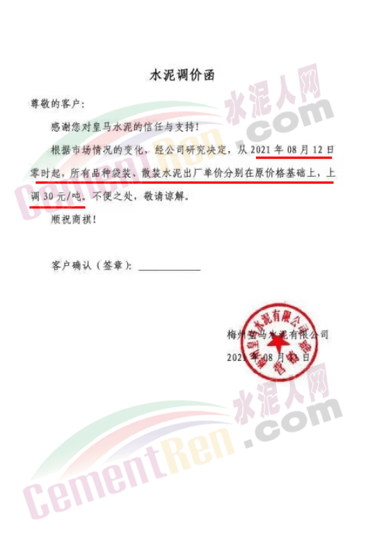 梅州皇馬水泥有限公司通知,自8月12日零時(shí)起,所有品種袋裝、散裝水泥出廠價(jià)上調(diào)30元/噸。