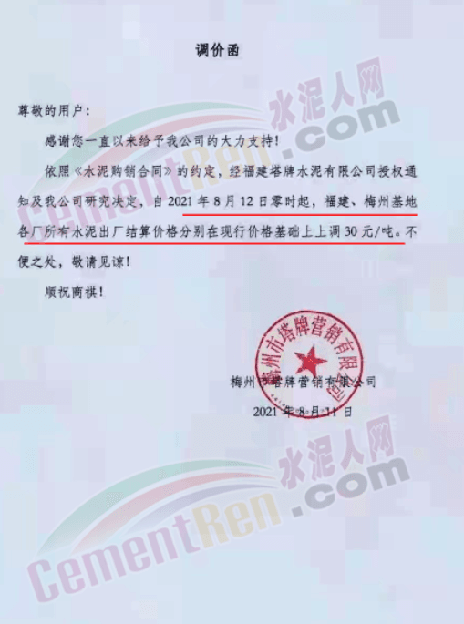 梅州市塔牌營銷有限公司通知,經(jīng)福建塔牌水泥有限公司授權(quán)通知,自8月12日零時(shí)起,福建、梅州基地各廠所有水泥出廠結(jié)算價(jià)上調(diào)30元/噸。