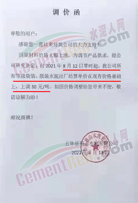 五華縣眉山水泥有限公司通知因原材料價(jià)格大幅上漲,為調(diào)節(jié)產(chǎn)品供求,經(jīng)公司研究決定,自8月12日零時(shí)起所有袋裝、散裝水泥出廠價(jià)上調(diào)30元/噸。