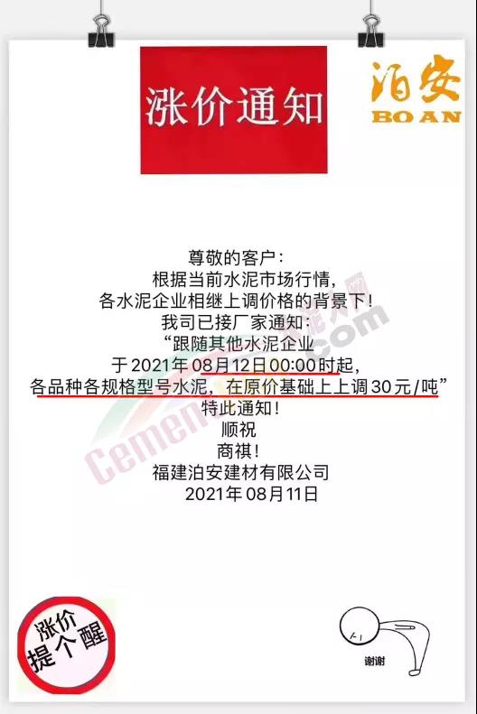福建泊安建材通知,根據(jù)當(dāng)前水泥市場行情,各水泥企業(yè)相繼上調(diào)價(jià)格的背景下,公司已經(jīng)接廠家通知,跟隨其他水泥企業(yè)于8月12日0時(shí)起各品種各規(guī)格型號(hào)水泥,在原價(jià)基礎(chǔ)上上調(diào)30元/噸。