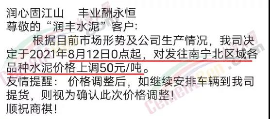 8月11日華潤水泥通知,根據(jù)目前市場形勢(shì)及公司生產(chǎn)情況,公司決定于8月12日0點(diǎn)起對(duì)發(fā)往南寧區(qū)域各品種水泥上調(diào)50元/噸。
