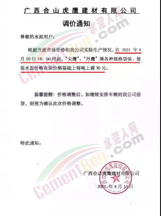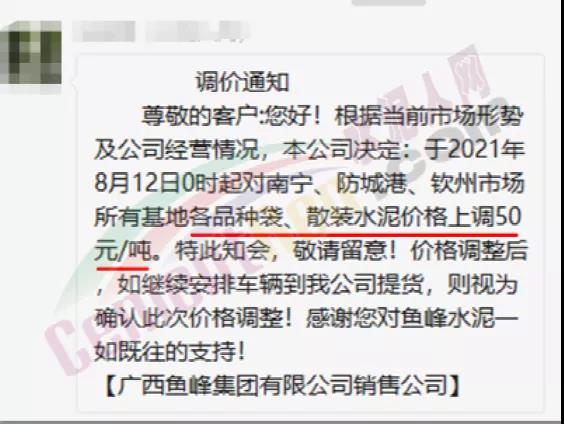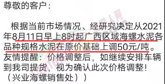 同日,興業(yè)海螺水泥通知自8月11日早8時(shí)起,廣西區(qū)域海螺水泥各品種規(guī)格上調(diào)50元/噸。