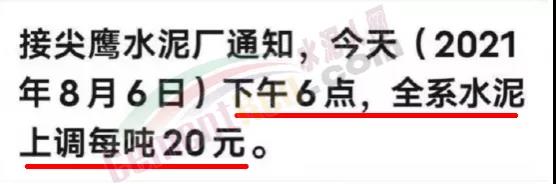 尖鷹水泥廠通知自8月6日下午6時(shí),全系水泥上調(diào)20元/噸。