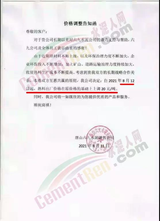 8月11日唐山六九水泥通知,由于近期原材料不斷上漲。以及環(huán)保治理力度不斷加大,企業(yè)環(huán)保投入不斷增加,加上礦山、道路運(yùn)輸治理力度持續(xù)加大,致使熟料生產(chǎn)成本不斷提高。公司決定自8月12日起,熟料出廠價(jià)格在原價(jià)格的基礎(chǔ)上上調(diào)20元/噸。
