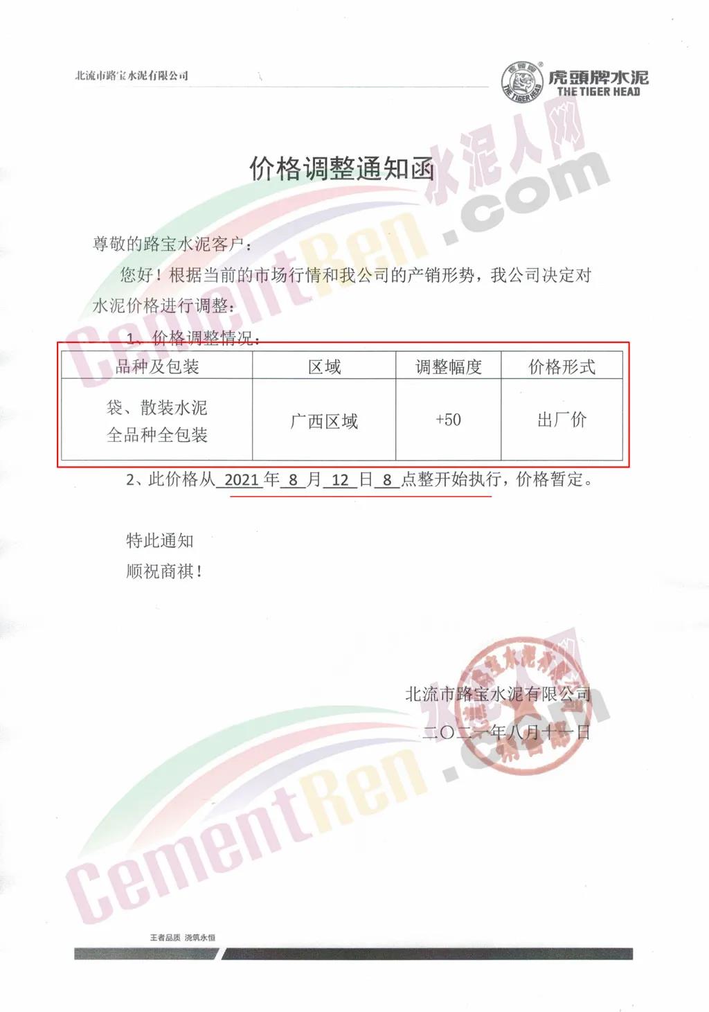 根據近期市場形勢,我司決定于2021年8月13日00:00起,對全廣西區(qū)域的全品項水泥價格上調50元/噸。