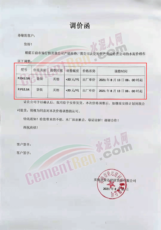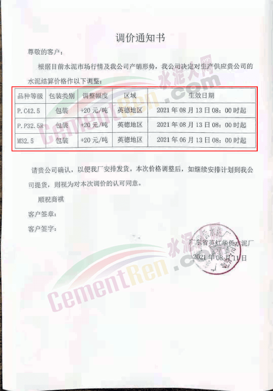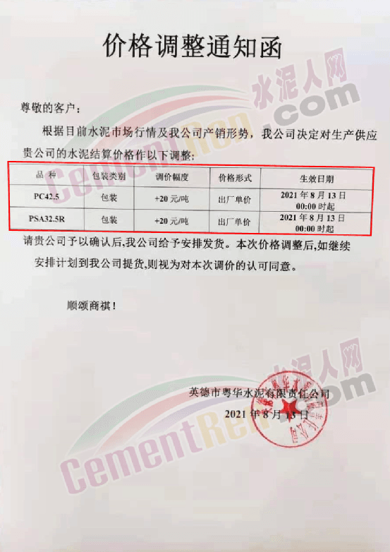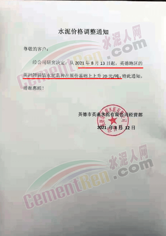 廣東省英紅華僑水泥廠通知,自8月13日8時起P.C42.5及P.P32.5R包裝水泥對英德地區(qū)上調20元/噸。