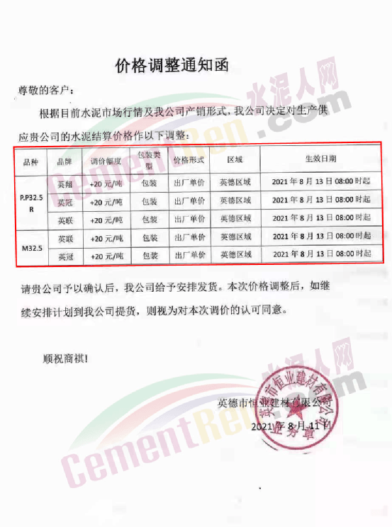 英德市恒業(yè)建材有限公司通知,自8月13日8時起旗下英翔、英冠、英聯品牌P.P32.5R包裝水泥及英聯、英冠品牌M32.5包裝水泥出廠價上調20元/噸。