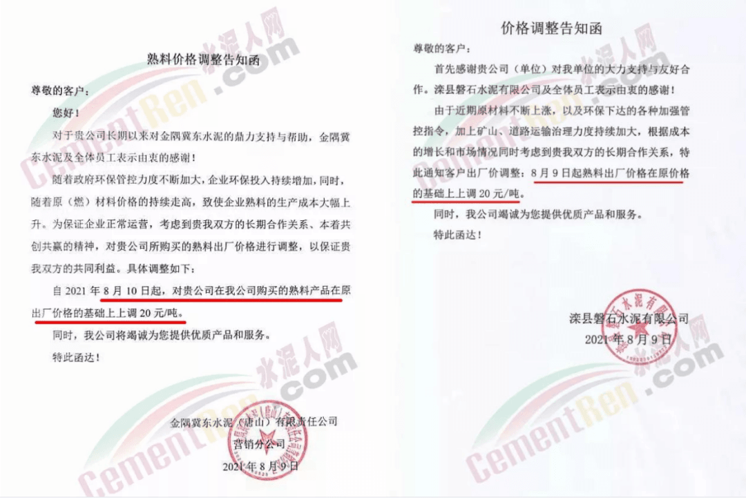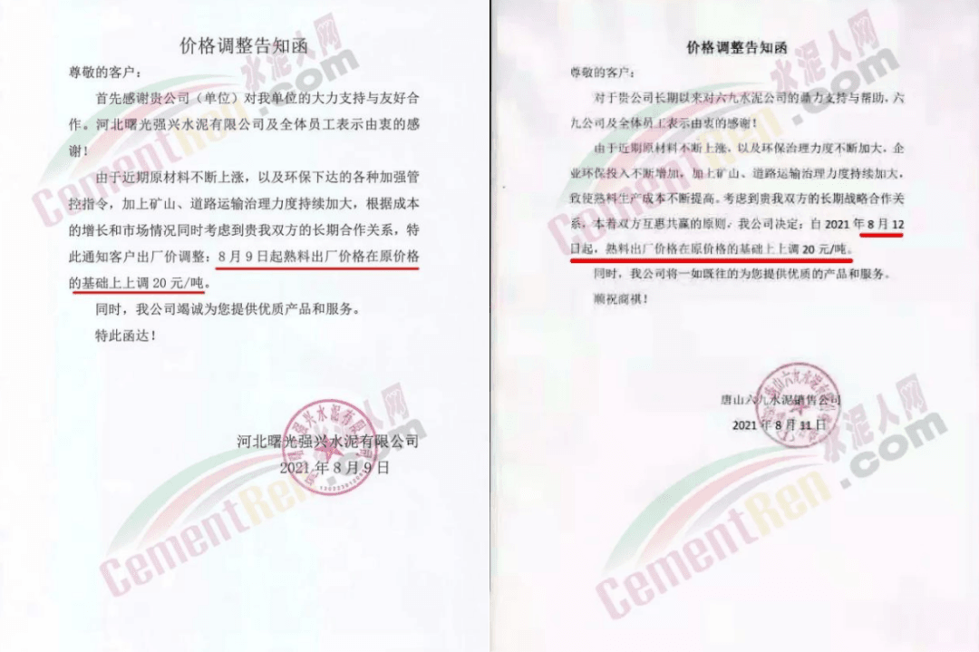 同期,水泥價格也出現跟漲。8月12日四川億鑫聯水泥有限公司通知,由于當前市場變化情況,經公司研究決定,自8月13日旱上7時起,對公司袋裝、散裝水泥在原價格基礎上上調50元/噸。價格調整后,如您繼續(xù)安排車輛到公司提貨,則視為確認本次價格調整。