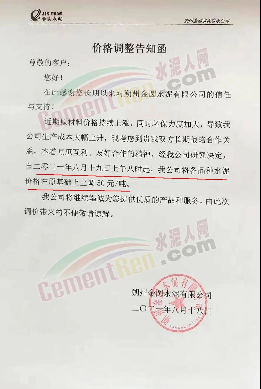 朔州金圓水泥有限公司通知近期原材料價格持續(xù)上漲,同時環(huán)保力度加大,導致公司生產(chǎn)成本大幅上升,經(jīng)公司研究決定,自2021年8月19日上午8時起,將各品種水泥價格在原基礎(chǔ)上上調(diào)50元/噸。
