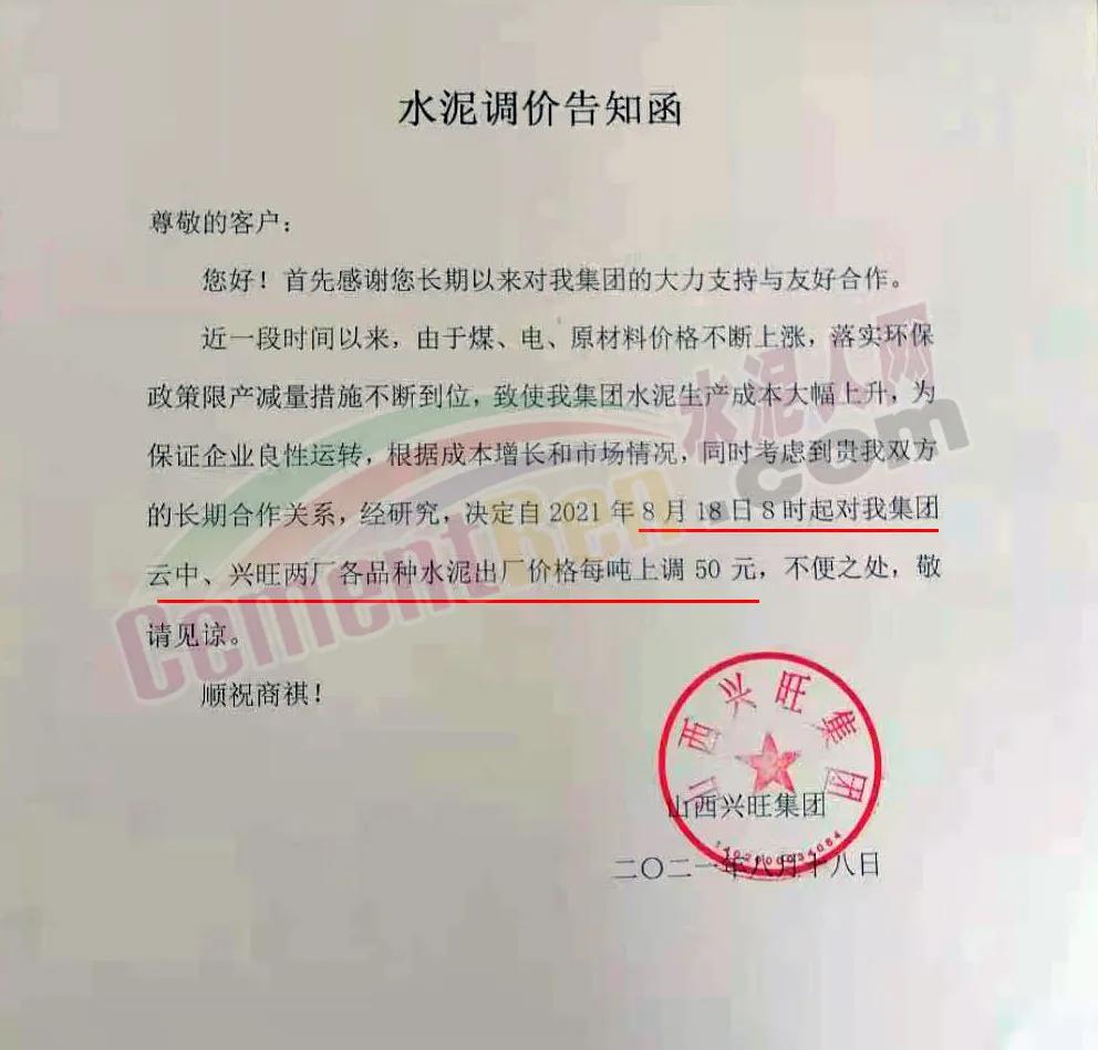 山西興旺集團通知稱,近一段時間以來,由于煤、電、原材料價格不斷上漲,落實環(huán)保政策限產(chǎn)減量措施不斷到位,致使企業(yè)水泥生產(chǎn)成本大幅上升,為保證企業(yè)良性運轉(zhuǎn),根據(jù)成本增長和市場情況,經(jīng)研究決定自2021年8月18日8時起對集團云中、興旺兩廠各品種水泥出廠價格上調(diào)50元/噸。