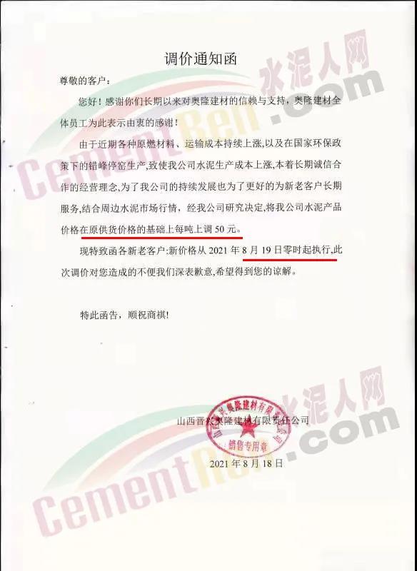 山西晉興奧隆建材有限責任公司通知,由于近期各種原燃材料、運輸成本持續(xù)上漲,以及在國家環(huán)保政策下的錯峰停窯生產(chǎn),致使公司水泥生產(chǎn)成本上漲,結(jié)合周邊水泥市場行情,經(jīng)公司研究決定,將水泥產(chǎn)品價格在原供貨價格的基礎(chǔ)上上調(diào)50元/噸,新價格從2021年8月19日零時起執(zhí)行。