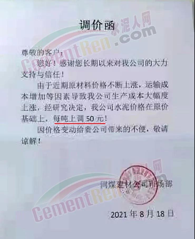 同煤建材公司市場部通知,由于近期原材料價格不斷上漲,運輸成本增加等因素導致公司生產(chǎn)成本大幅度上漲,經(jīng)研究決定公司水泥價格在原價基礎(chǔ)上上調(diào)50元/噸。