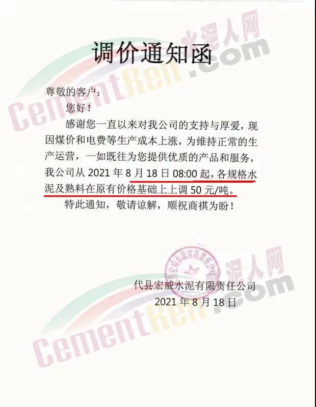 代縣宏威水泥有限責任公司通知,因煤價和電費等生產(chǎn)成本上漲,為維持正常的生產(chǎn)運營,公司從2021年8月18日8時起,各規(guī)格水泥及熟料在原有價格基礎(chǔ)上上調(diào)50元/噸。