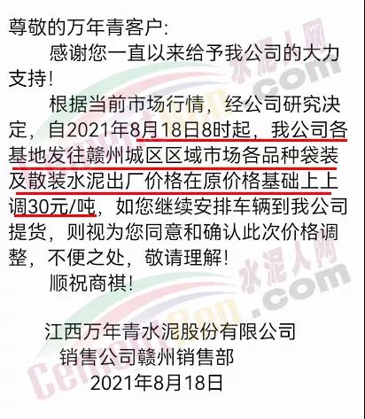 江西萬年青水泥股份有限公司銷售公司贛州銷售部通知根據(jù)當前市場行情,經(jīng)公司研究決定,自2021年8月18日8時起,公司各基地發(fā)往贛州城區(qū)區(qū)域市場各品種袋裝及散裝水泥出廠價格在原價格基礎(chǔ)上上調(diào)30元/噸。
