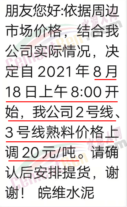 皖維水泥通知,依據(jù)周邊市場價格,結(jié)合公司實際情況,決定自2021年8月18日上午8時開始,公司2號線、3號線熟料價格上調(diào)20元/噸。