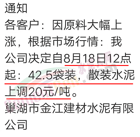 巢湖市金江建材水泥有限公司通知稱,因原料大幅上漲,根據(jù)市場行情公司決定自8月18日12點起42.5袋裝,散裝水泥上調(diào)20元/噸。