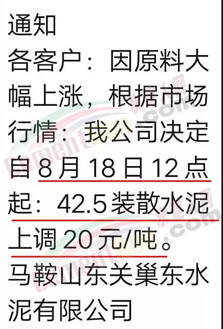 馬鞍山東關(guān)巢東水泥有限公司通知因原料大幅上漲,根據(jù)市場行情公司決定自8月18日12點起42.5裝散水泥上調(diào)20元/噸。