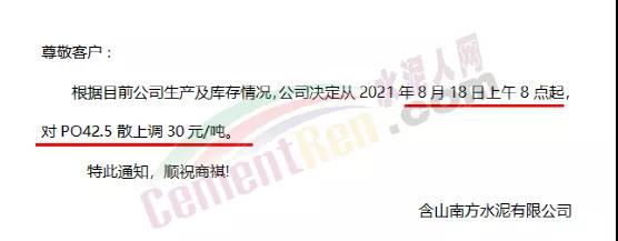 含山南方水泥有限公司通知根據(jù)目前公司生產(chǎn)及庫存情況公司決定從2021年8月18日上午8點起,對PO42.5散上調(diào)30元/噸。